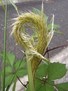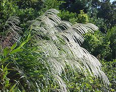 尾花(オバナ): オバナは「ススキ」のことで、漢字で「薄」や「芒」が万葉集には「尾花」と記されています。イネ科の多年草で、日当たりの良い草地など、山野のいたるところに群生します。花穂が最初の出穂の頃の形が写真のように、動物の尾に似ていることから「尾花」と呼ばれたようです。藁ぶき屋根や土壁の材料に使われました。②