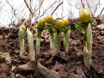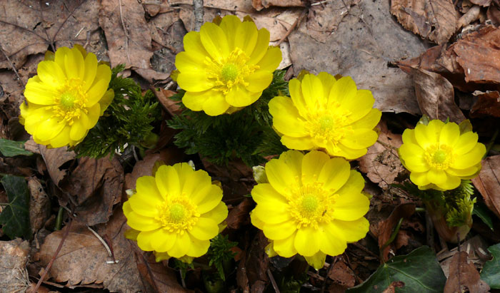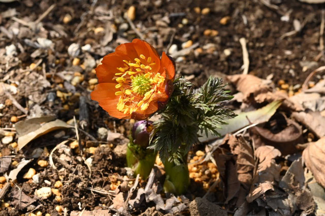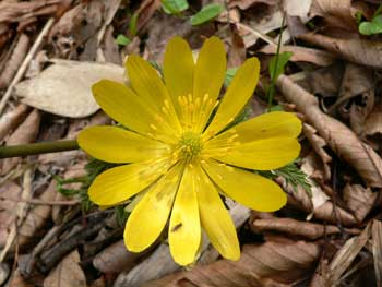 今月の花ごよみ は フクジュソウ(福寿草)です。 フクジュソウ(福寿草)は、キンポウゲ科の多年草。典型的なスプリング・エフェメラルであり、春を告げる花の代表である。そのため、元日草(がんじつそう)や朔日草(ついたちそう)の別名を持つ。福寿草という和名もまた新春を祝う意味があり、縁起物の植物として古くから栽培されてきた。江戸時代より多数の園芸品種も作られている古典園芸植物で、フクジュソウとミチノクフクジュソウをかけ合わせた「福寿海」をはじめ、緋色や緑色の花をつけるものなど多数の品種がある。自生地が北海道から九州にかけてである。